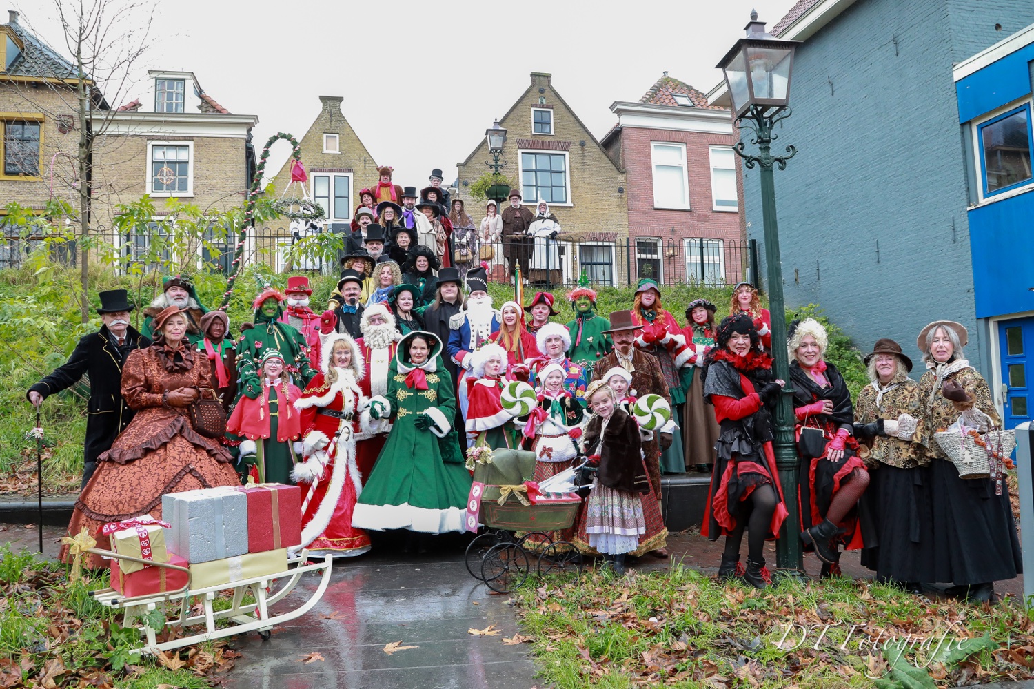 Groep mensen verkleed in Charles Dickens kleding staan op een brug in Maassluis tijdens een kerstmarkt.